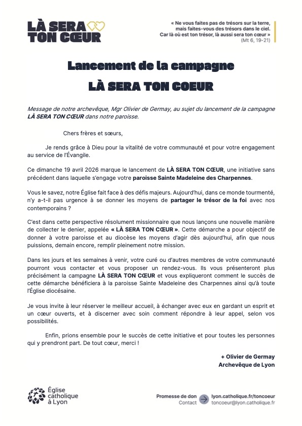 Voici ci-dessous une lettre adressée par Mgr Olivier de Germay, notre archevêque, à tous les paroissiens :